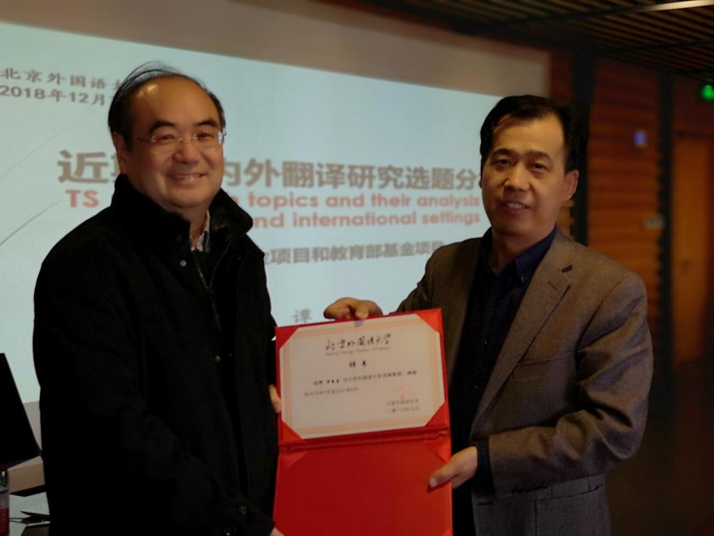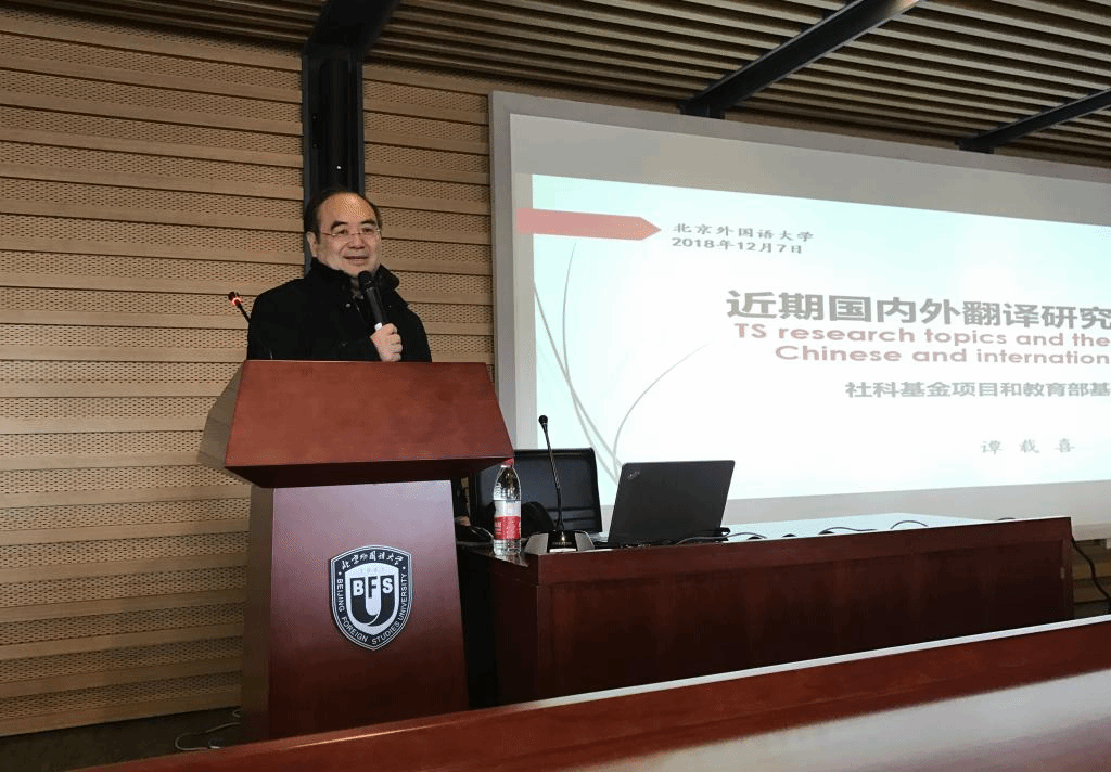 仪式后,谭载喜教授详细讲述了近五年来国家社科基金项目和教育部人文社科项目翻译学立项情况,并结合国际相关研究做了细致的讲解分析,提出科研选题的6项原则和5字心诀。