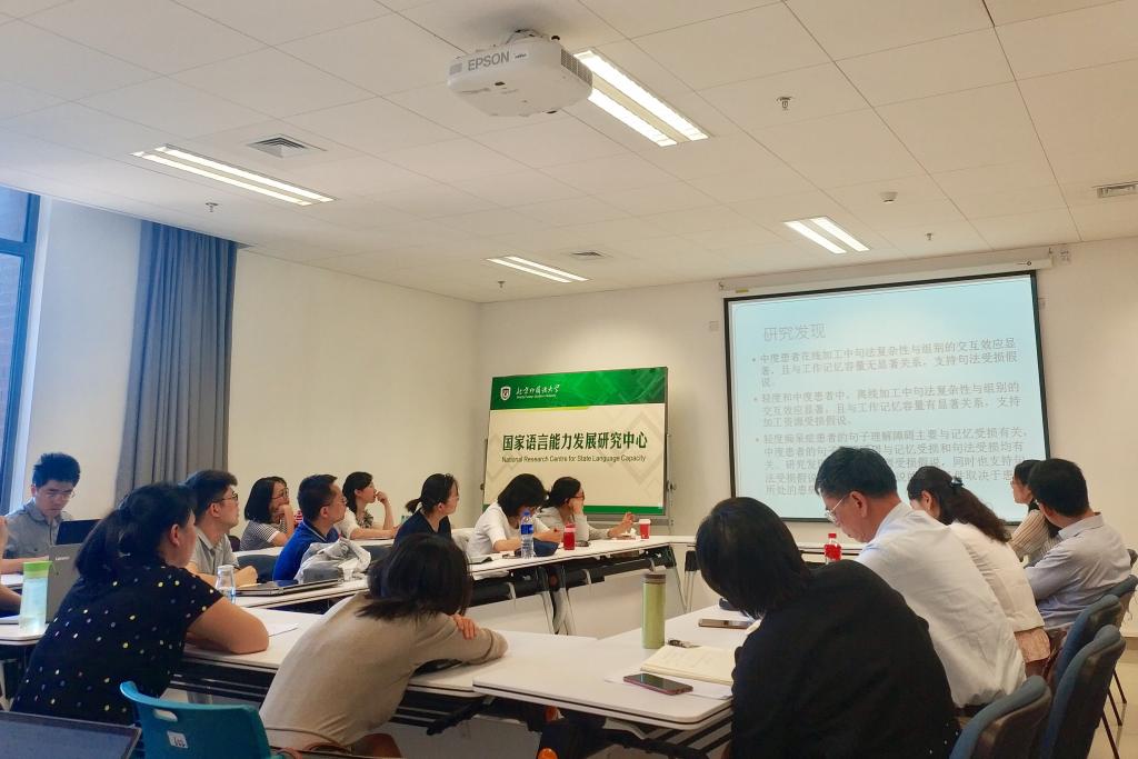本次研讨会上,柳鑫淼老师结合自身专业,作了题为“阿尔茨海默症患者汉语句子理解障碍研究”的报告。首先,柳老师介绍了研究背景,指出了目前国内主要以综述性研究为主的研究现状以及国内外学界对阿尔茨海默症患者存在语言理解障碍所持的两种观点。然后,柳老师通过三个实验设计对研究问题进行了探讨,并总结了各实验的研究发现及其临床意义。汇报结束后,王文斌教授、何伟教授、郭洁副教授等针对研究主题、研究前景、实验过程等提出宝贵意见,在座其他师生针对研究方法、实验数据等细节展开了热烈讨论。柳老师的研究新颖有趣、论证详实,得到了大家的赞扬。